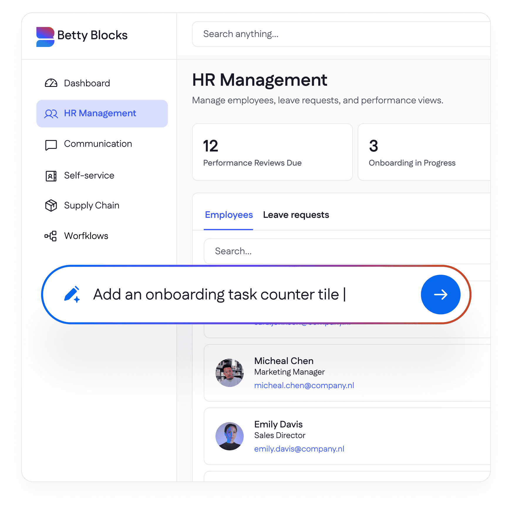 Betty Blocks offers visual modeling, reusable components, API-first architecture, cloud-native deployment, and AI-assisted development to accelerate delivery. Schedule a demo at your convenience and see the platform in action.